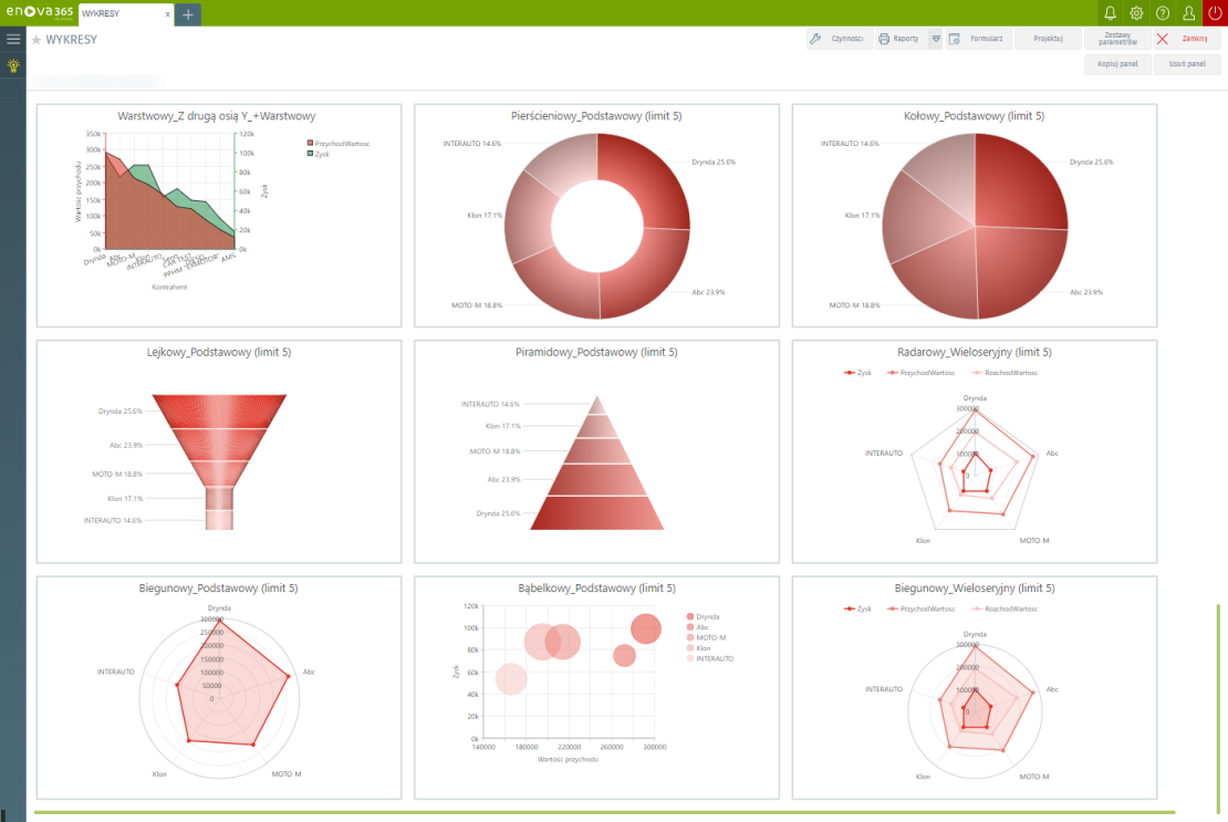 Działania związane z analizą i przyswajaniem danych stają się przyjemniejsze i skuteczniejsze dzięki przystępnej formie graficznej. Panele BI enova365 pozwalają szybko monitorować wskaźniki, ponieważ są one zwizualizowane w formie wykresów, tabel czy tabel przestawnych. Moduł BI oferuje bogaty wachlarz typów prezentacji danych: od wskaźników (KPI) prezentujących skondensowane informacje, przez tabele z możliwością grupowania, sortowania i sumowania, aż po wiele rodzajów wykresów (kołowe, kolumnowe, bąbelkowe, lejkowe, piramidowe, radarowe, warstwowe, punktowe, pierścieniowe). Możliwe jest również wykorzystanie raportów przestawnych, które są najbardziej powszechną formą wizualizacji danych, dającą możliwość dynamicznej zmiany układu danych. Dla większej przejrzystości można zastosować kolorowanie wierszy czy wskaźników.