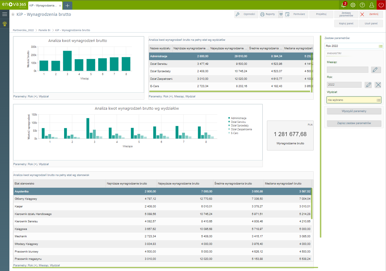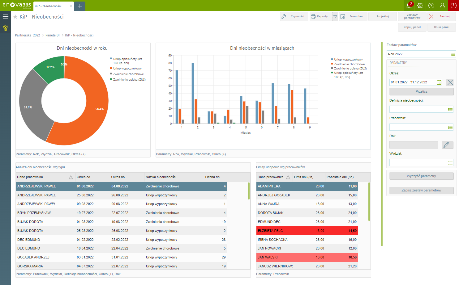 Wskaźniki HR w enova365 dostępne są w module Kadry Płace, dzięki panelom Business Intelligence. System zbiera dane z ewidencji czasu pracy, nieobecności, płac i pozwala na ich analizę w czasie rzeczywistym. Bez eksportów, bez Excela, bez błędów.