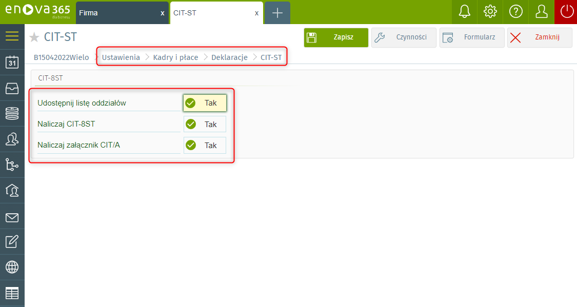 Zmiany w zakresie CIT-8ST, czyli nowy formularz deklaracji CIT-8ST(1) wraz z załącznikiem CIT/A(1), mechanizmy do przygotowania i wysyłki eDeklaracji oraz wydruk pomocniczy „Informacja CIT-8ST(1)” zostały udostępnione Klientom enova365, którzy korzystają z modułu Księgowość w wersji 2212.0.0 w ramach standardowej aktualizacji systemu.